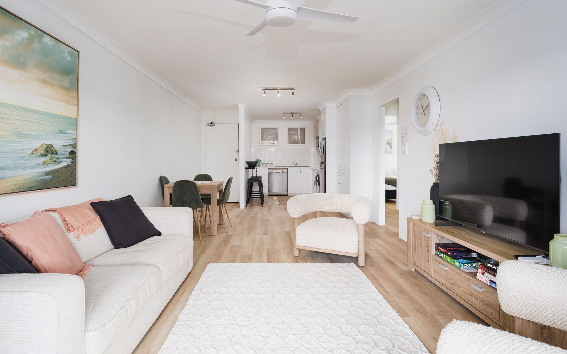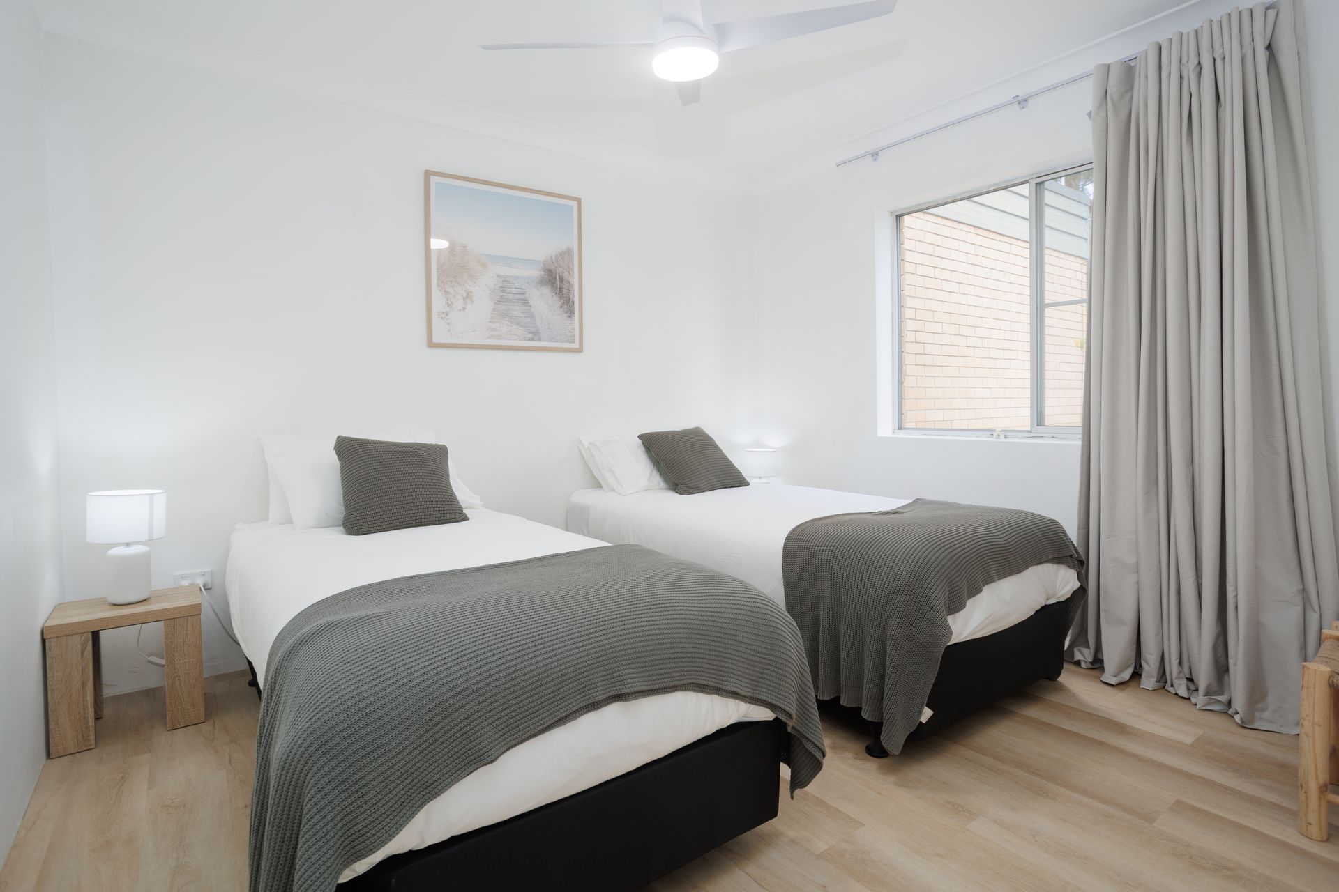 Experience Hidden Gem, a stunning holiday rental nestled in the picturesque town of Urunga, NSW that perfectly caters to a group of up to 6 guests. Boasting two bedrooms - one outfitted with a plush queen-size bed, another containing 2 comfortable king single beds (can be made in to a King bed on request) and a sleep sofa/futon in the lounge, this apartment is the ideal space for a family getaway or a retreat with friends. A newly renovated bathroom accompanies the bedrooms, equipped with essentials like a shower, toilet, and tasteful linens, along with a handy hair-dryer for your convenience.