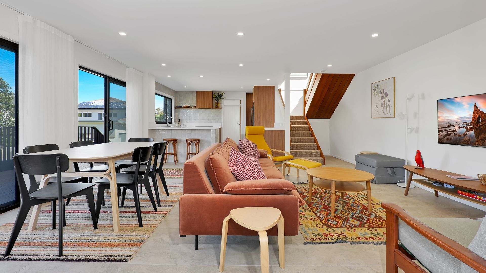 Nina's Place boasts three beautifully-furnished bedrooms and two immaculate bathrooms. Revel in the palatial comfort of a King-sized bed in the master suite accompanied by an ensuite while the second bedroom houses a plush Queen sized bed. Equipped with 2 singles in the third room and a single bed with a trundle in a communal sleeping area.