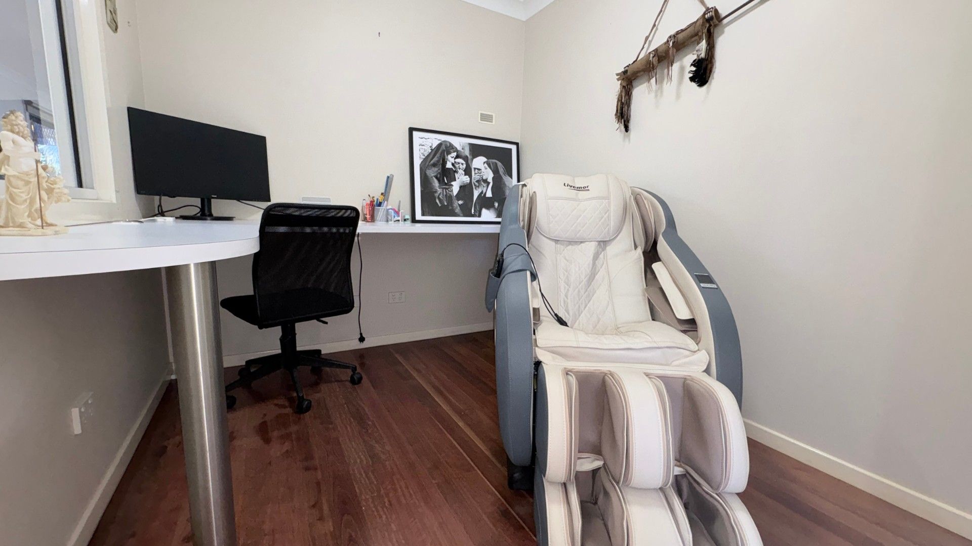 The middle level offers the remaining three bedrooms (two with queen beds and one with a double), along with a study equipped with a desk, chair, and a relaxing massage chair, perfect for easing into holiday mode or taking a break while working remotely. This level also includes the main bathroom with both a shower and bathtub, a fully equipped kitchen, an inviting dining area, and a comfortable lounge room ideal for relaxing after a day of exploring.